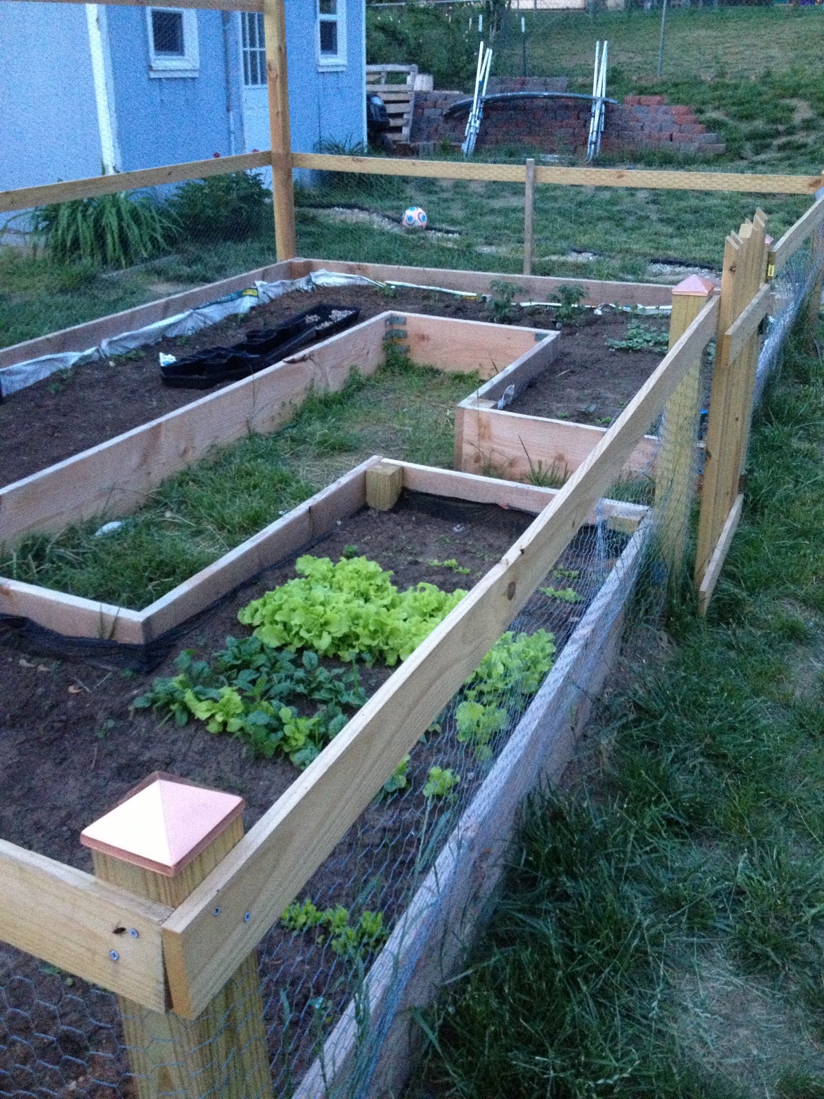 This was last week. This week it looks even better. The beans and peas are growing along the side edges, cucumbers are up and the corn is about 5 inches tall now, radishes and two tomato plants finish out this garden. I have been enjoying the fresh spring lettuce (light green color) and spinach leaves in salads. In the far part of the yard I threw out potatoes, they are now growing, the asparagus is done and strawberries, mulberries are ready for picking.